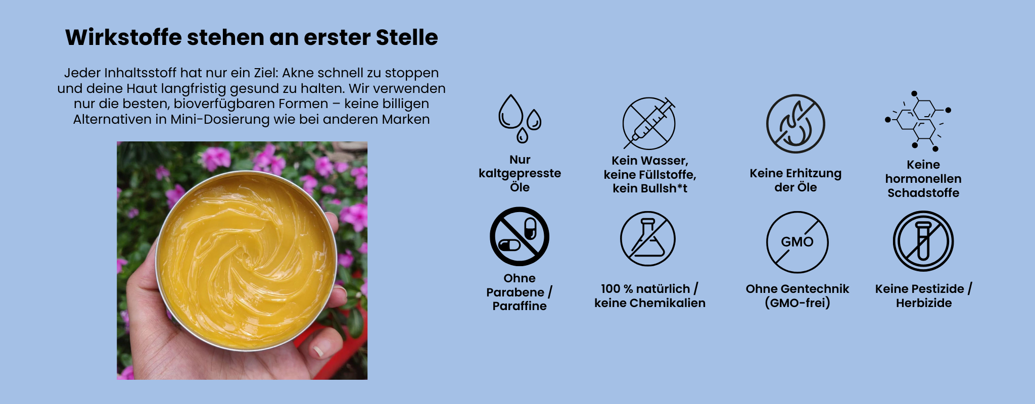 Ich empfehle diese Formel, weil sie die Haut nicht nur oberflächlich behandelt, sondern die tieferen Ursachen von Akne gezielt anspricht. Die pflanzlichen Inhaltsstoffe sind wissenschaftlich fundiert und besonders gut verträglich